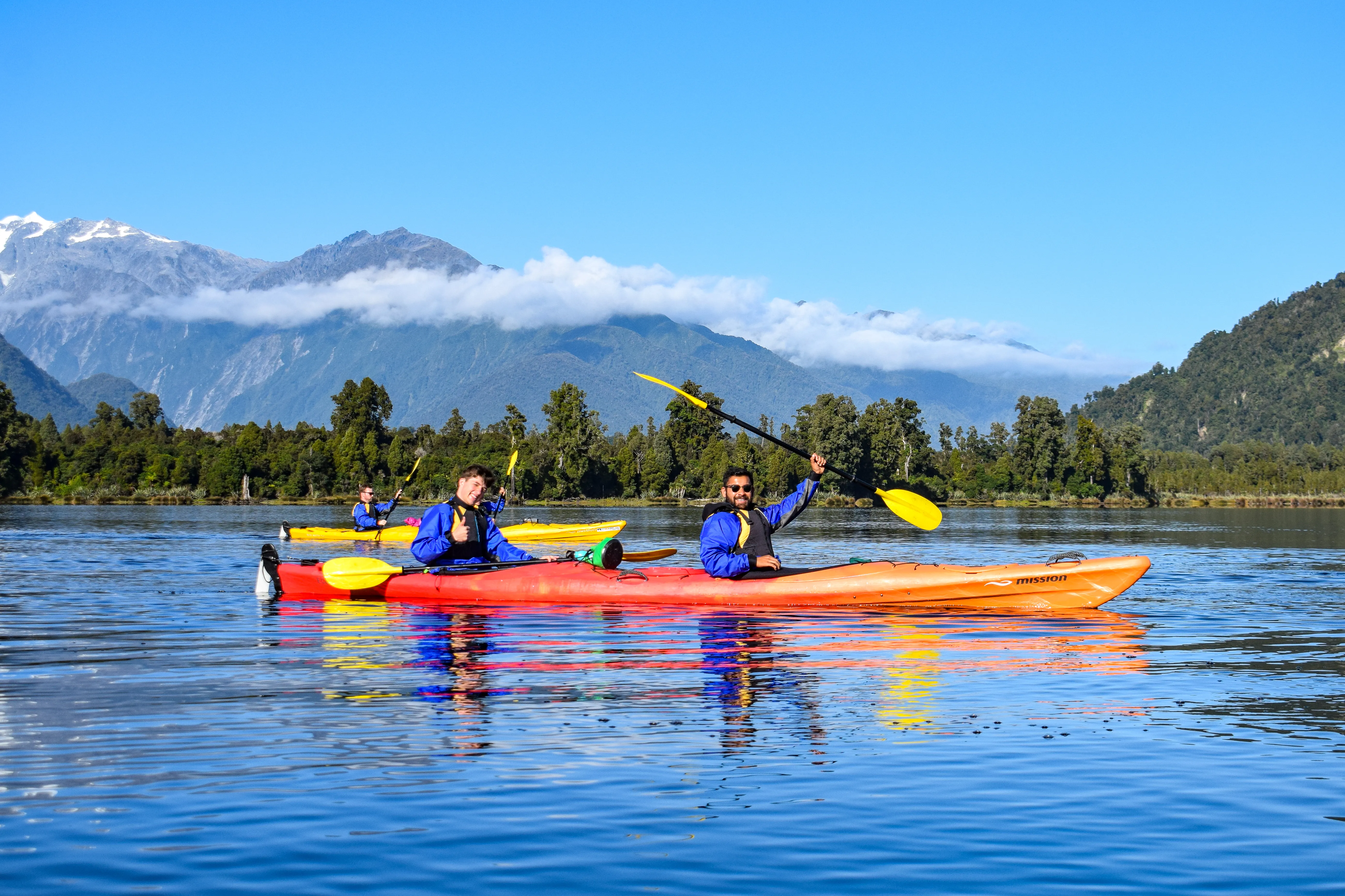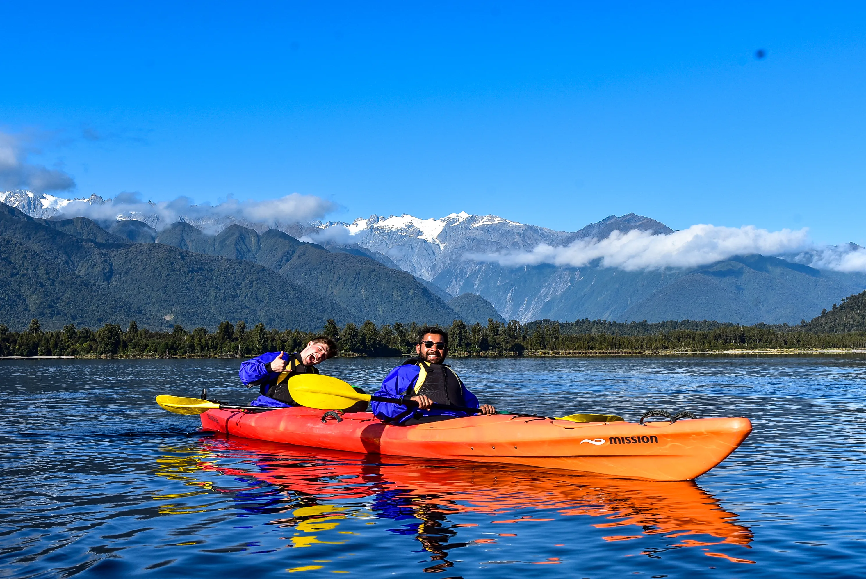 New Zealand has literally got it all - from hiking in the bushes and rafting in the canyon to kayaking in the lakes - glacial lakes. For our last adventure, we found ourselves in Franz Josef, a few minutes from Lake Mapourika. We spent the morning marveling at the mighty Southern Alps - with a few other tourists and Cody and Dylan (our guides). We kayaked the calm waters for a couple of hours learning about the regionโs fascinating geology and exploring the serenity! Fun fact of the day: A Kiwi protection program run by the government has increased the population of almost-extinct kiwi birds many folds, Albeit, at roughly $10,000 per egg ๐ธ