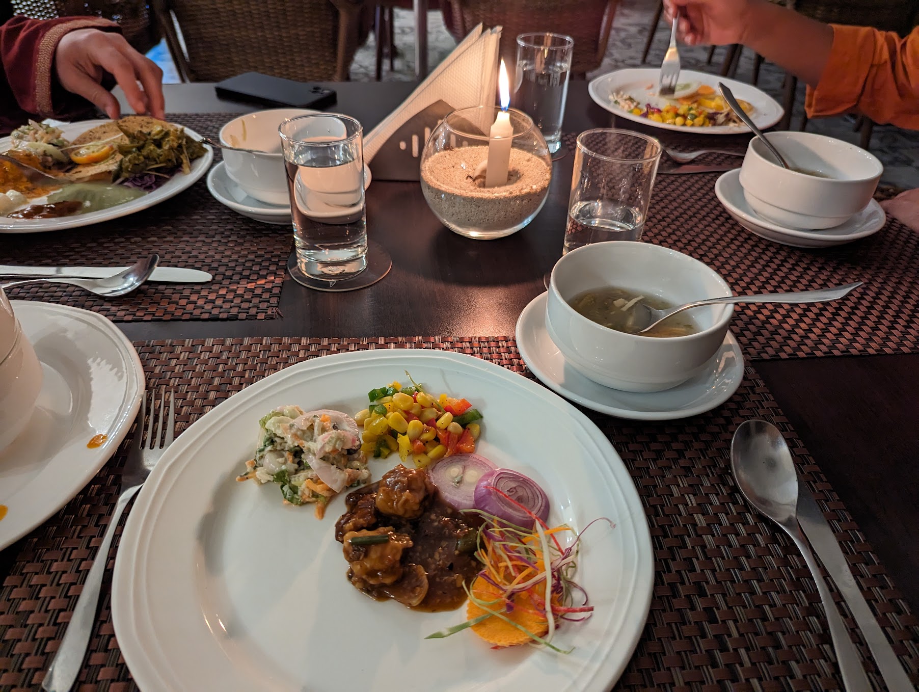 We stayed at three different islands during the week and at all accomodations, our breakfast and dinner was included as buffet-style meals in the stay package. While the quality of service and choice of dishes varied vastly between accomodations, we were extremely happy with the quality and quantity of the food.